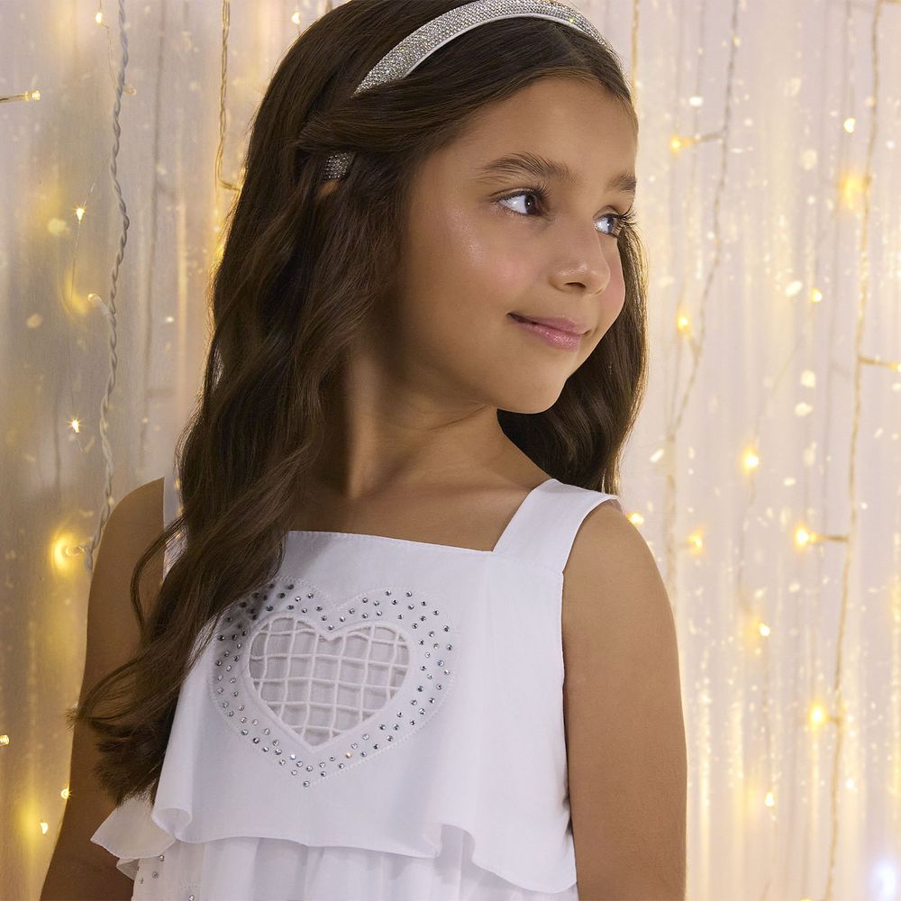 A modelagem traz alças largas e confortáveis, decote reto e recorte franzido na cintura, proporcionando caimento soltinho e fluido. Já a saia ganha ainda mais charme com os corações bordados em destaque, que se repetem harmoniosamente, criando um visual único e cheio de personalidade. Uma peça que une conforto, elegância e o brilho especial que toda menina merece para celebrar momentos inesquecíveis.