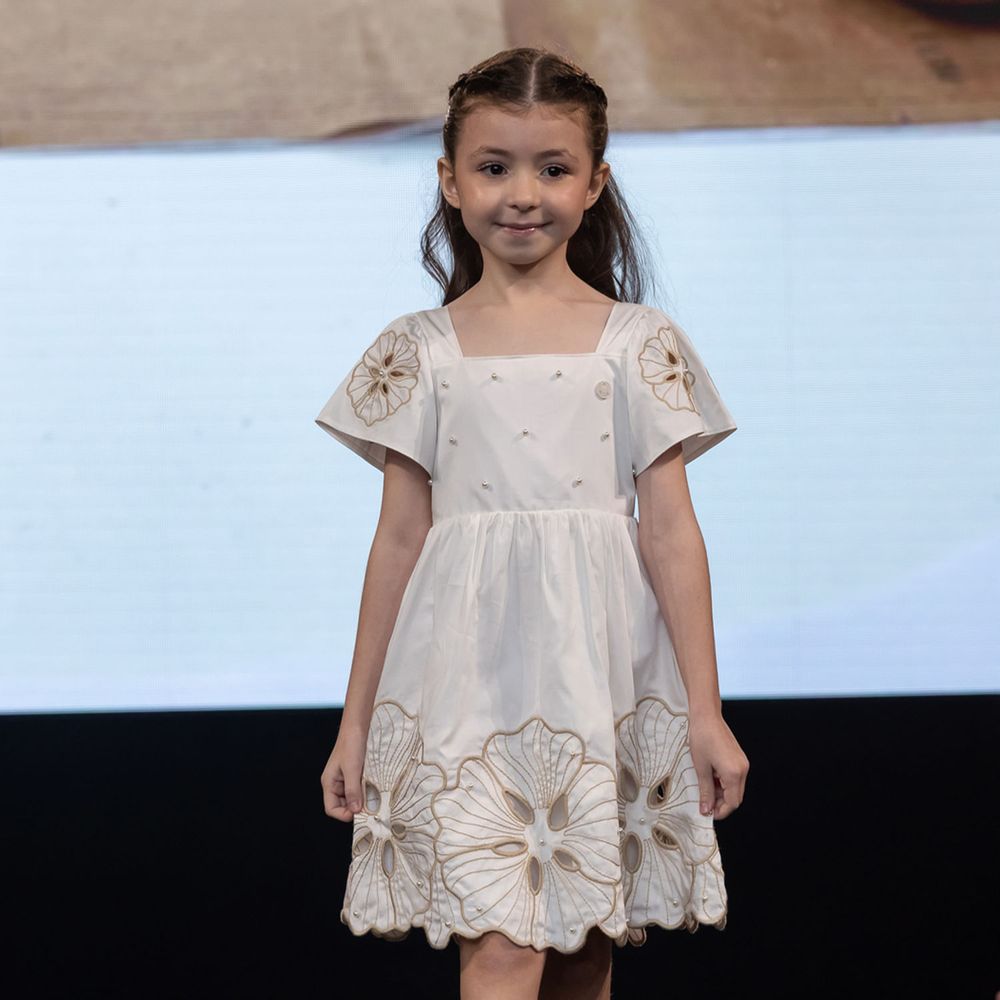 O destaque fica para os bordados de flores com aplicações de pérolas, que aparecem delicadamente nas mangas e na barra da saia, formando um visual encantador e sofisticado. A parte superior traz pérolas no busto e a charmosa plaquinha Milon, símbolo de elegância e bom gosto. As mangas amplas e delicadamente bordadas deixam o visual ainda mais gracioso, enquanto a saia rodada confere movimento e romantismo à peça. Em tom off white, esse vestido é perfeito para celebrar momentos cheios de ternura e brilho, com todo o conforto e a sofisticação que a Milon sabe oferecer.
