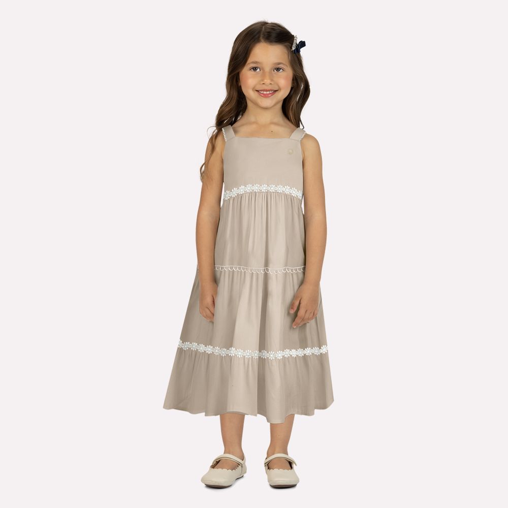 Os babados com franzidos ao longo da saia criam volume equilibrado e um efeito visual gracioso, conferindo leveza e charme ao caminhar. Os aviamentos aplicados de forma sutil acrescentam riqueza aos detalhes, e a plaquinha Milon finaliza o design com assinatura elegante e discreta. Em tom bege neutro e versátil, este vestido é uma escolha refinada para ocasiões especiais ou produções mais elaboradas do dia a dia, unindo conforto, delicadeza e um acabamento impecável.